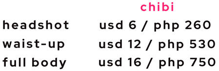 • Commission Type (ex. Headshot)• Details (poses/expression/bg color/etc)• Paypal Email/ Gcash No.: (i use invoices on paypal and money requests on gcash)• Email: (only applicable to clients who want to send the comm to another email address)• Reference Images: (images attached)